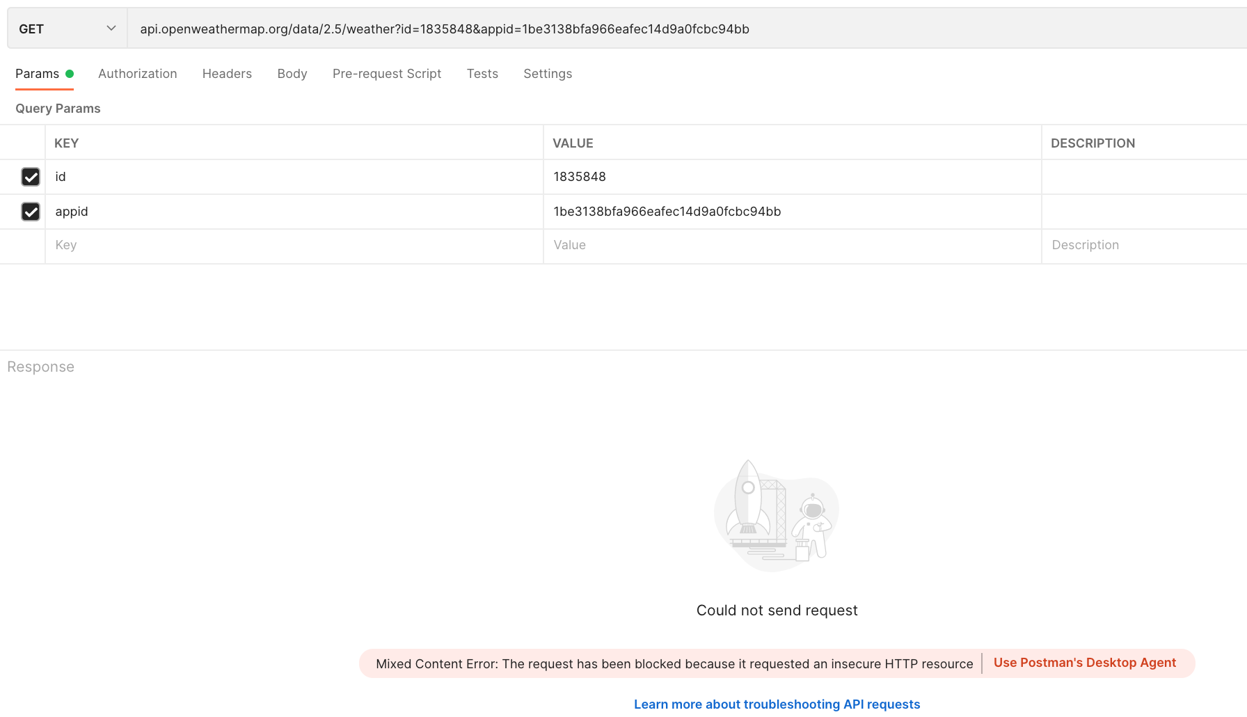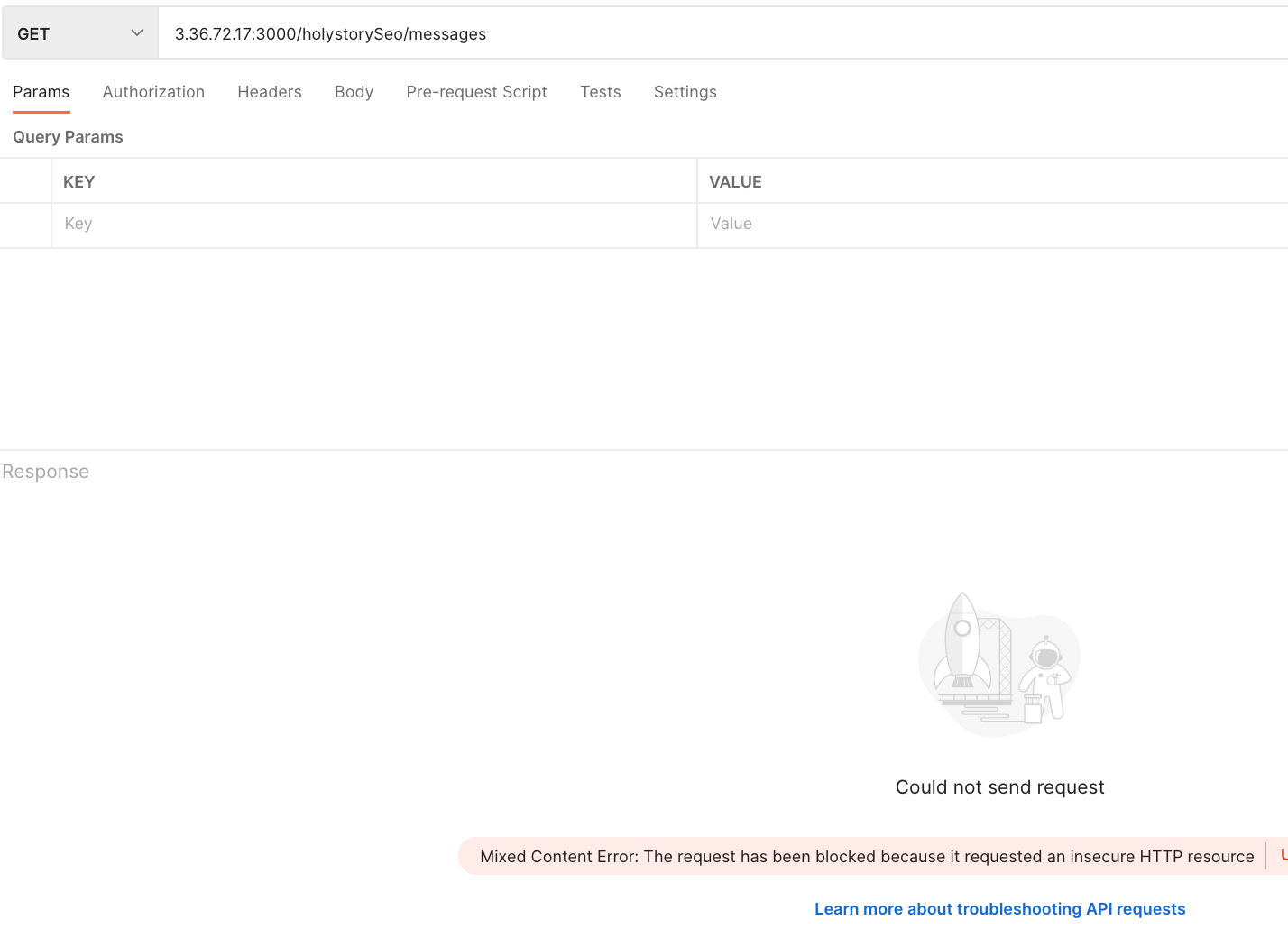 하지만 insecure HTTP 요청이라고 해서 POSTMAN에서 해당 request 자체를 하지 않고 있다.