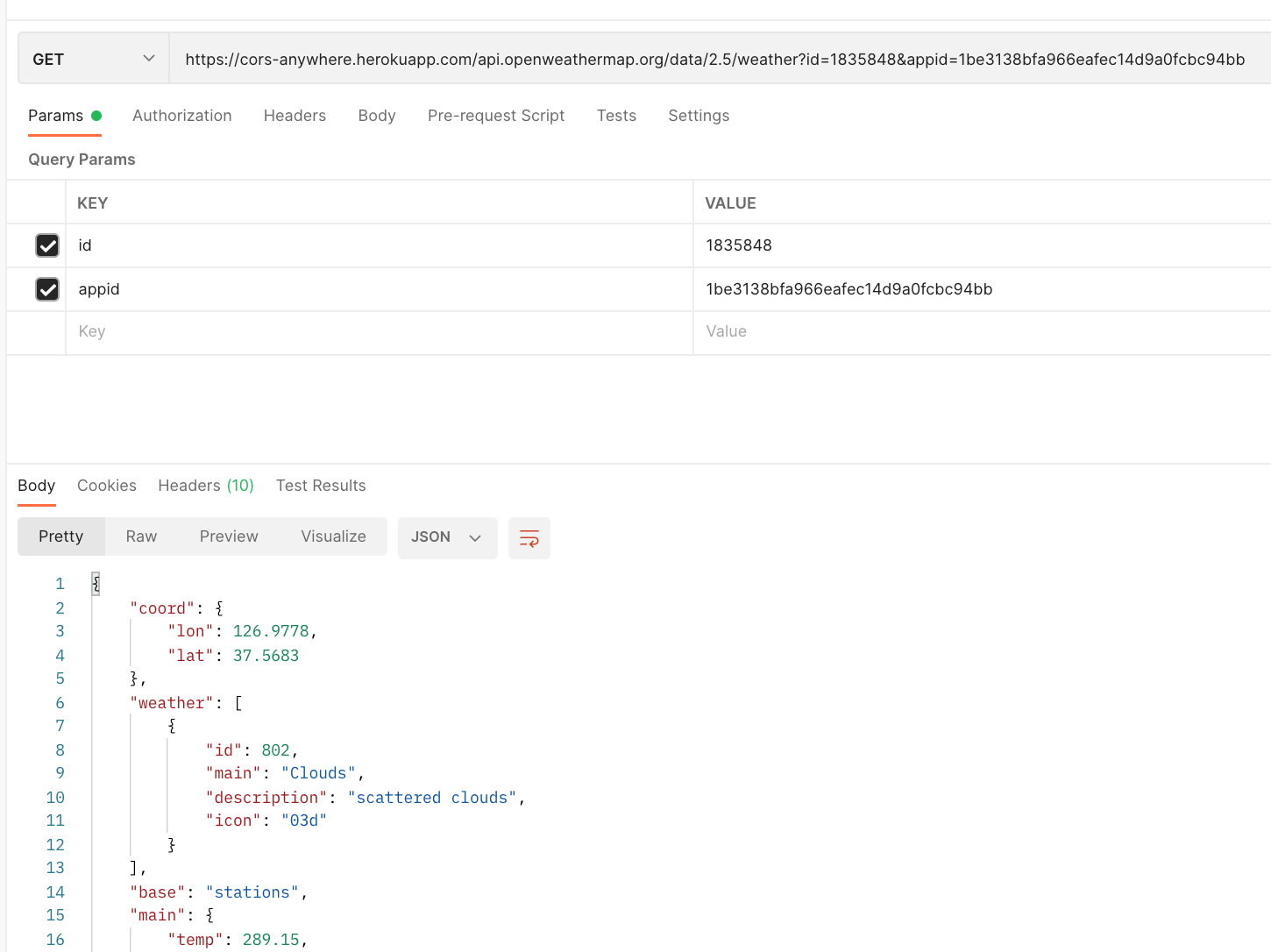 POSTMAN으로 openweathermap에서 획득한 API Key로 서울의 기후 정보를 GET메소드로 요청하였다.