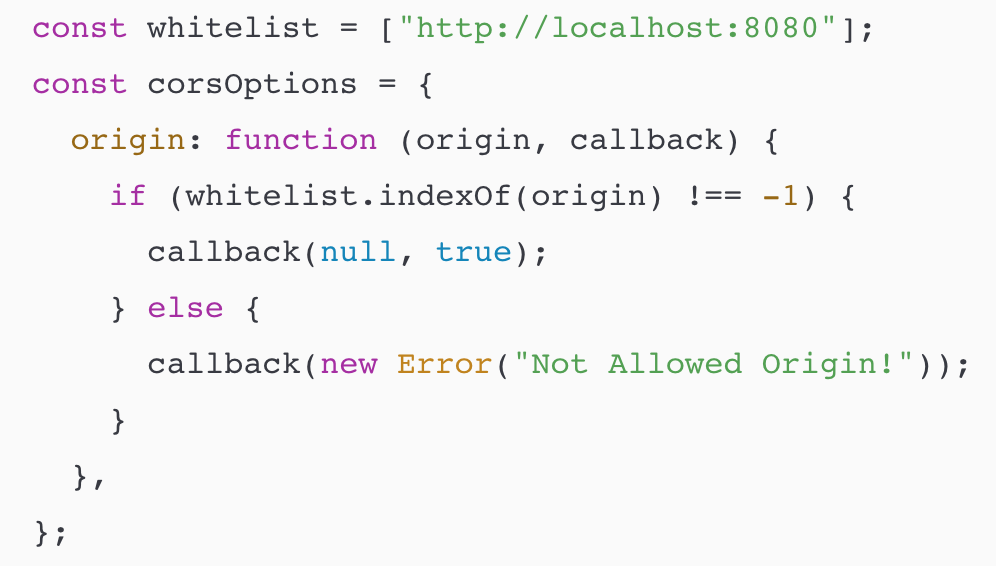 즉 클라이언트 입장에서 Cross-origin이겠지만 서로 다른 origin에서는 요청을 하는 클라이언트의 도메인을 자신의 서버 코드 어딘가에 whiteList라는 변수명을 설정하여 담아주는 방식으로 cross-origin의 요청에 대응을 하는 방식이다.