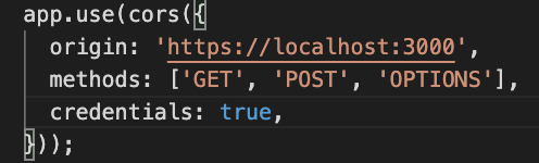 아래는 express.js 프레임워크에서 1개의 클라이언트에 대해서 https method와 origin 등 Cors 옵션 설정을 서버에서 해준 것이다.