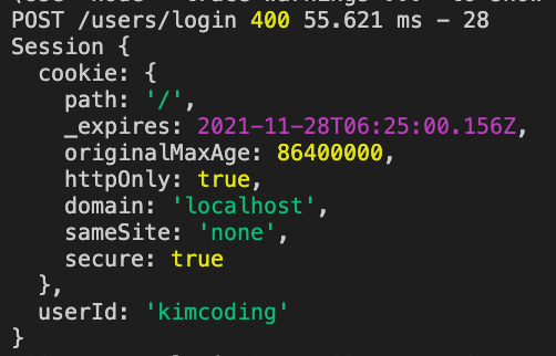 서버에서 설정한 session안의 cookie 정보가 요청(req)과 함께 들어온 것을 알 수 있다.