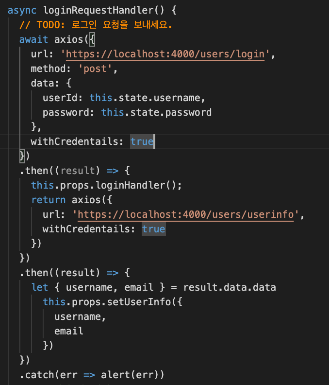 마찬가지로 axios.get 요청을 할 때도 withCredentials : true 이미 받은 세션id를 서버 측면에서 확인하고