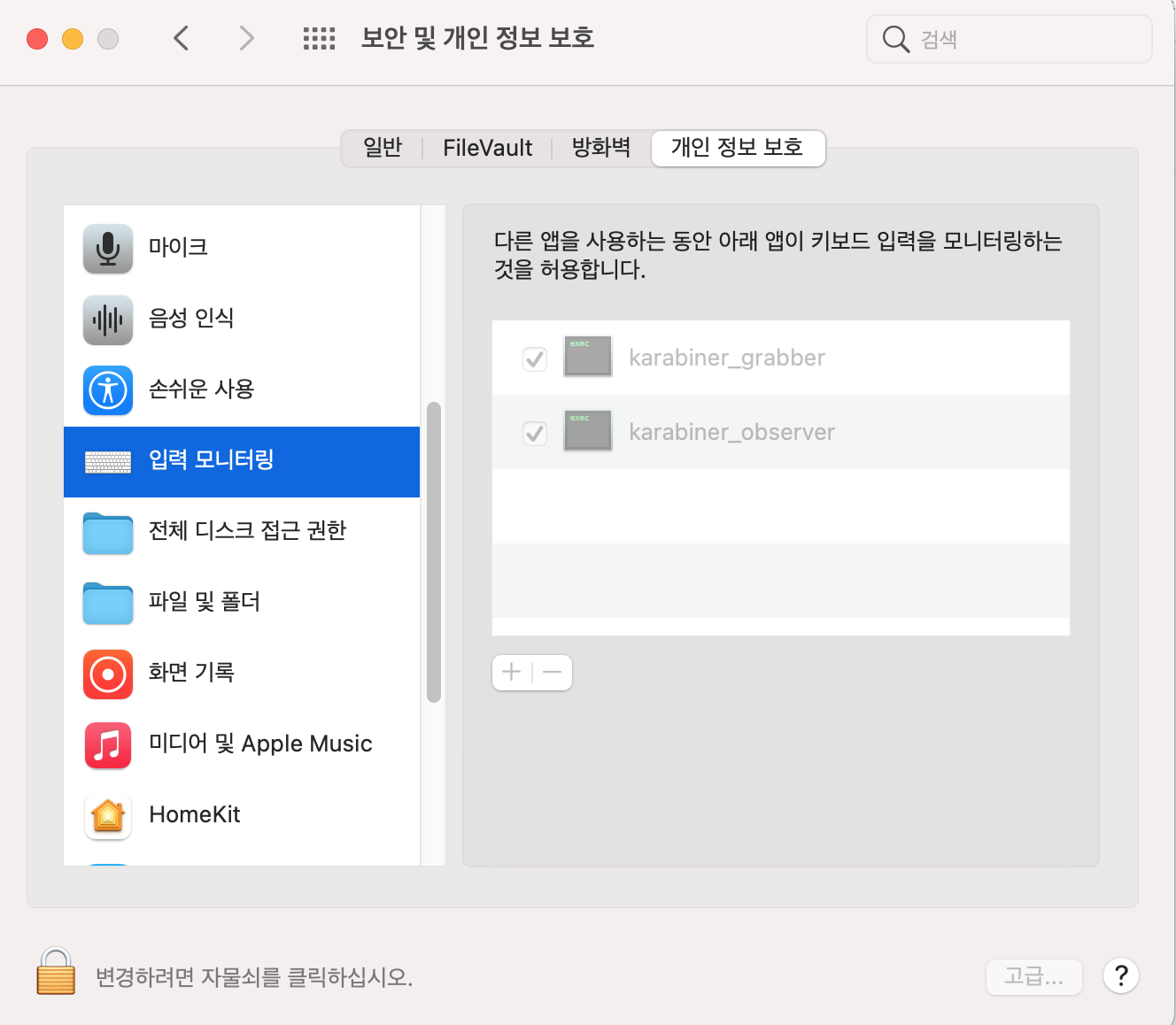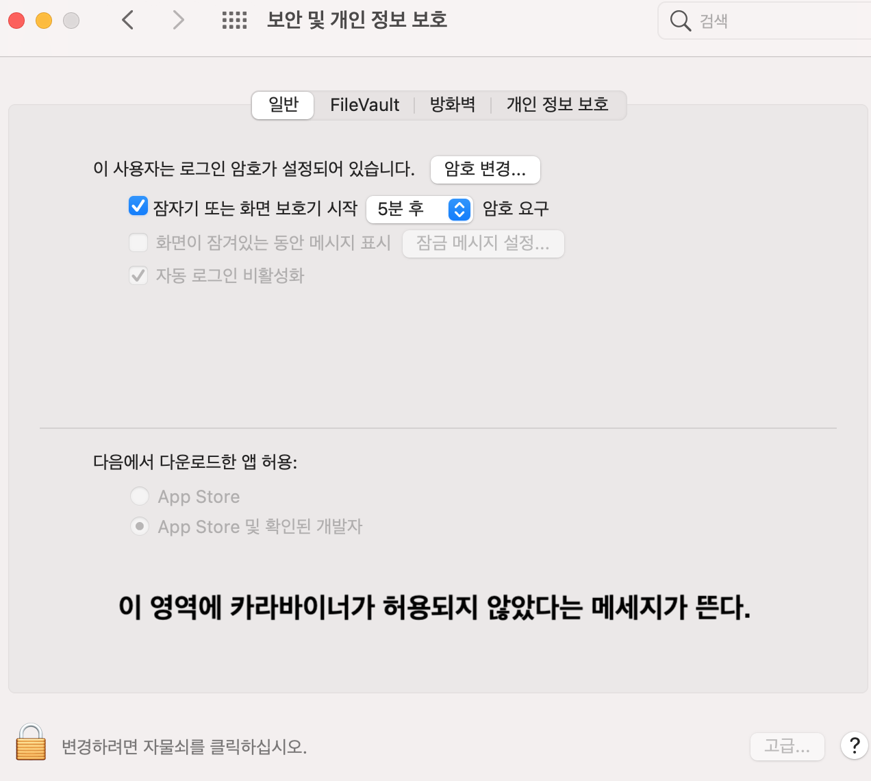 왼쪽 하단의 자물쇠를 풀어주고(비밀번호는 맥북 전원을 키면 입력해야 하는 번호다)