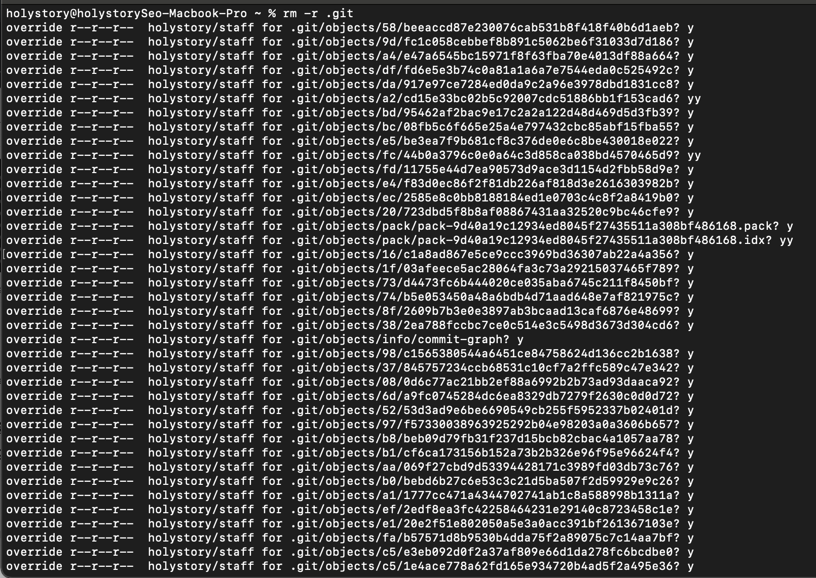 해결방법은 상위 디렉토리의 git init을 취소시켰다. 상위 디렉토리(위의 이미지에서는 holystorySeo 이다)에서 실수로 git init 명령어를 통해 git의 로컬 저장소로 지정하였던 것으로 추측이 된다. 자세히 파일들을 살펴보니 holystorySeo 폴더 안에 .gitignore, README.md 파일 등 git push와 관련된 파일들이 보인다.