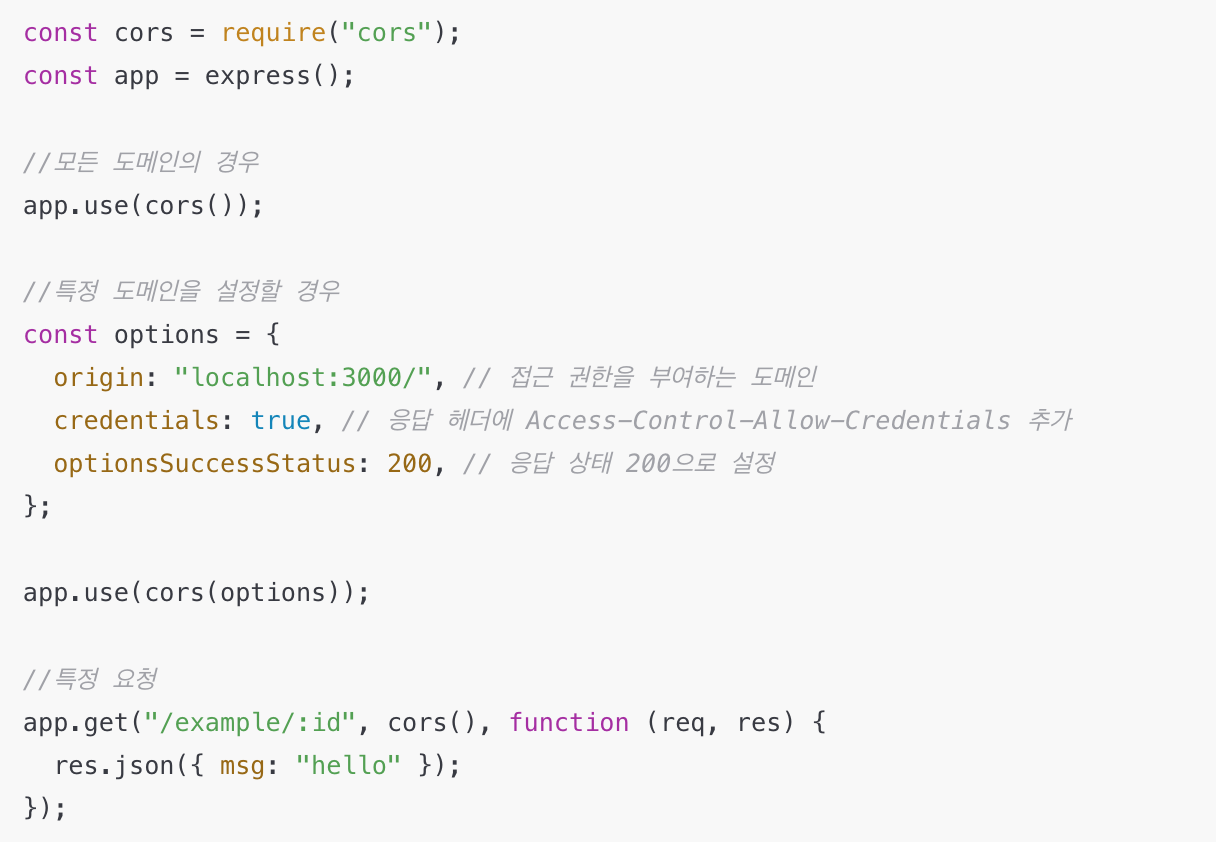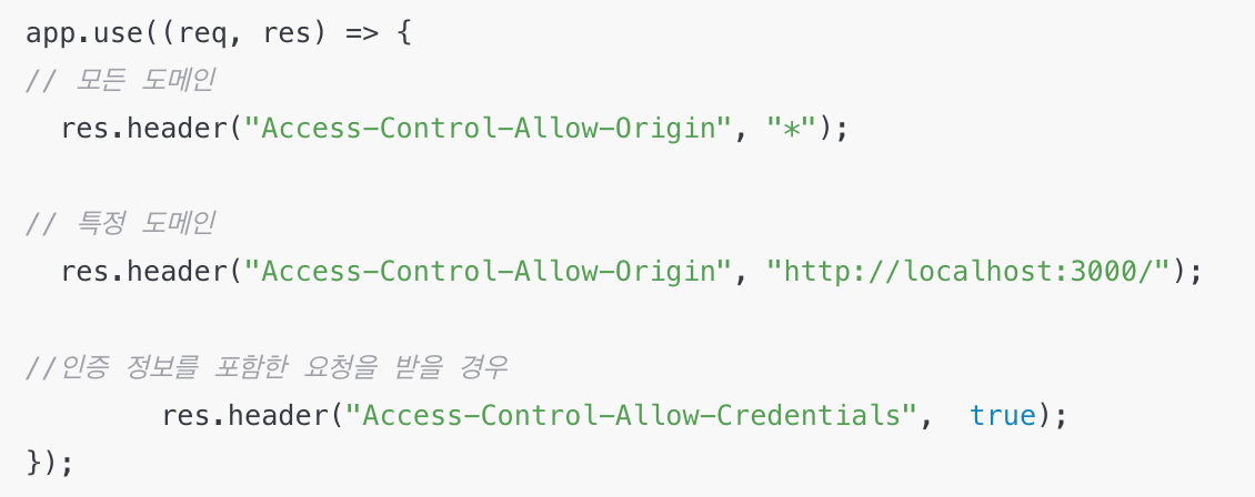 - 서버에서 응답 헤더에 Allow-Control-Allow-Origin: true 를 넣어줘야 한다.
