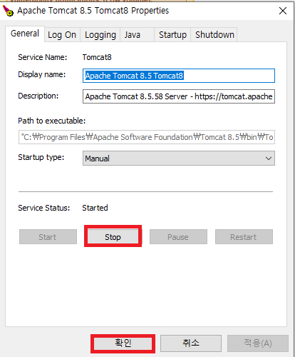 작업 표시줄에 있는 시계 옆에 Tomcat이 있는데 열어서 Stop후 확인을 눌러주세요.