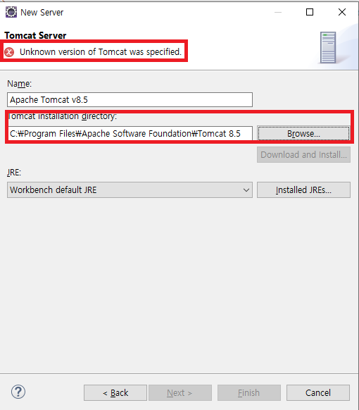 Tomcat위치를 지정해 주면 Unknown version of Tomcat was specified 라고 뜹니다.