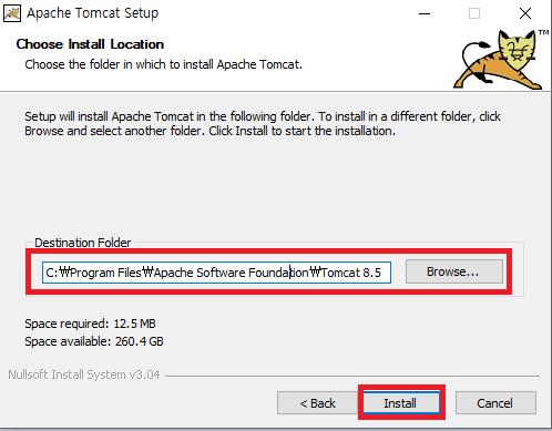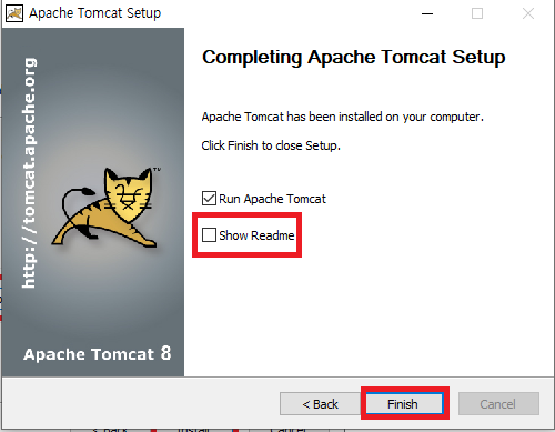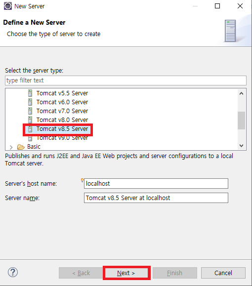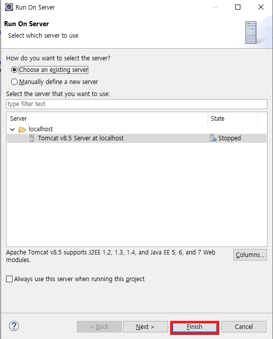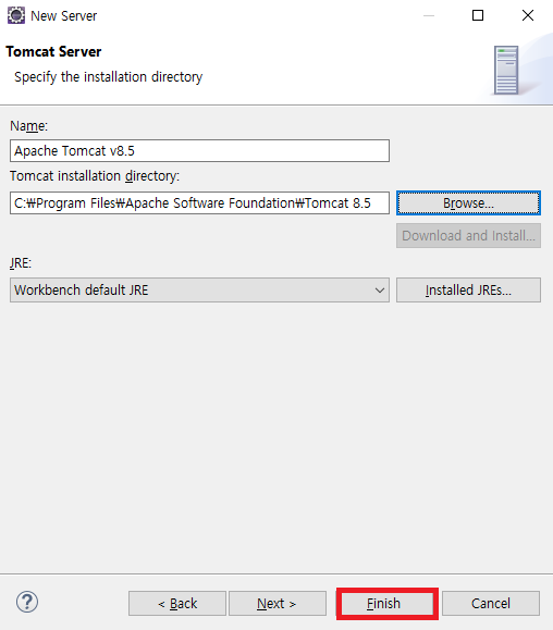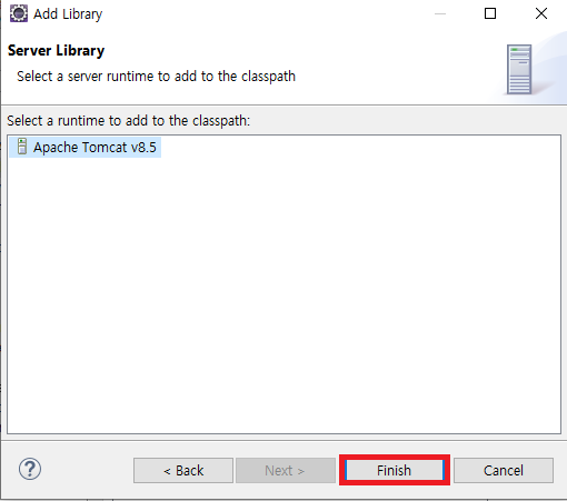 Apache Tomcat v8.5 선택 -> Finish 선택