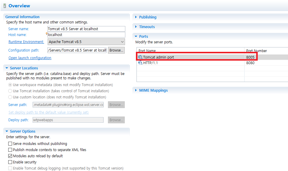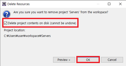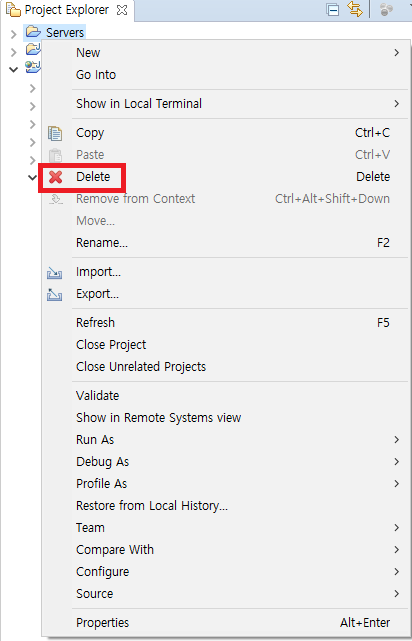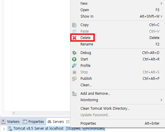 Servers에서 Tomcat과 Servers를 Delete project contents on disk를 체크하셔서 완전히 삭제 해주시고 다시 설정해 주시면 됩니다.