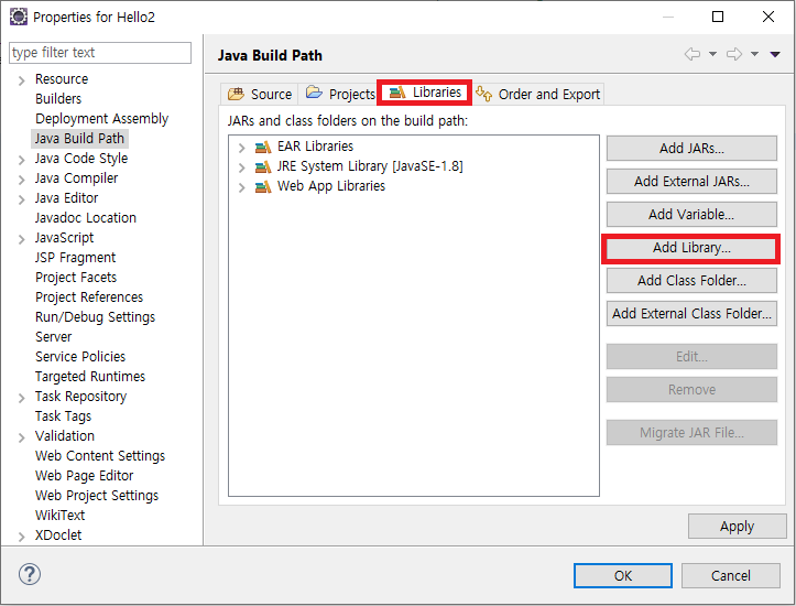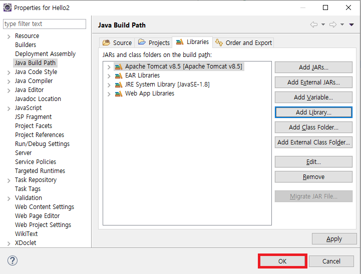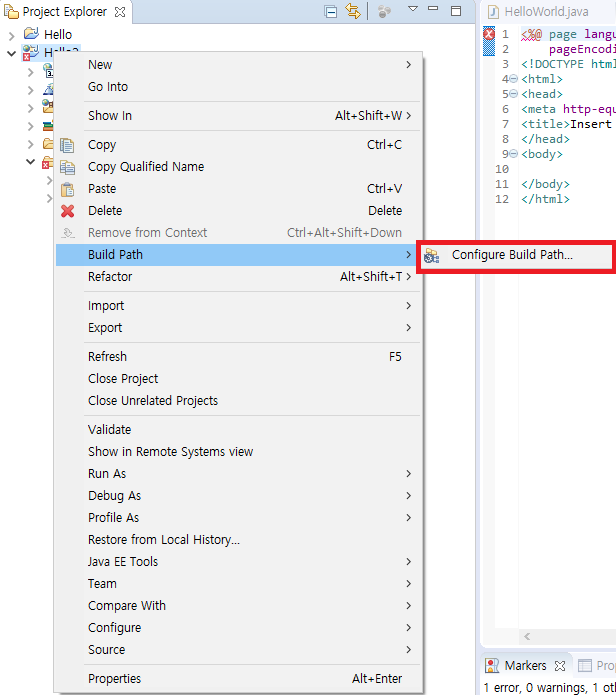 프로젝트 오른쪽 마우스 -> Build Path -> Configure Build Path