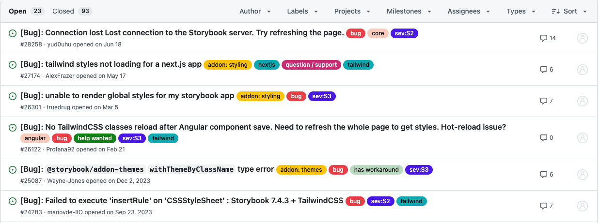 (추가 2024. 07) Storybook 최신 버전 8을 TailiwdCSS와 연동하여 사용하는 경우 tailwind가 적용이 안되는 이슈가 있습니다. Storybook 깃 레포의 이슈탭에는 아직도 여전히 처리가 되지 않고 있다. stable release가 3월에 되었지만 최초 버그가 제기된 이후로 여전히 해결이 되지 않고 있어 최신 Storybook에서 사용이 안되고 있습니다.