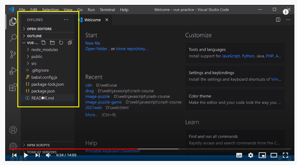 VS Code를 설치하면 위 그림의 왼쪽 노란박스 안처럼 최초의 폴더 및 파일 구조를 볼 수 있다.