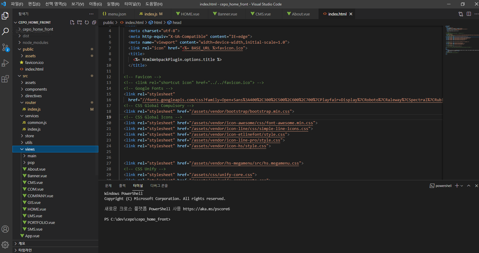 >> index.html :자바스크립트가 지원되지 않는 브라우저를 위한 안내 문구가 기재되어 있고, div 태그에 id=app만 가진 하나만 있음. 싱글 페이지 스크립트