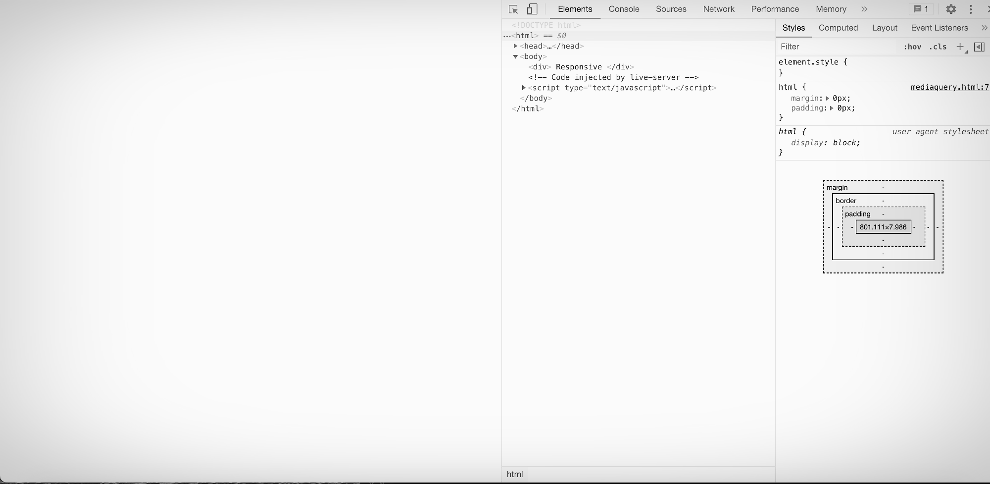 (화면의 크기가 최대 800px일 때까지는 div 태그를 보여주지 않겠다)