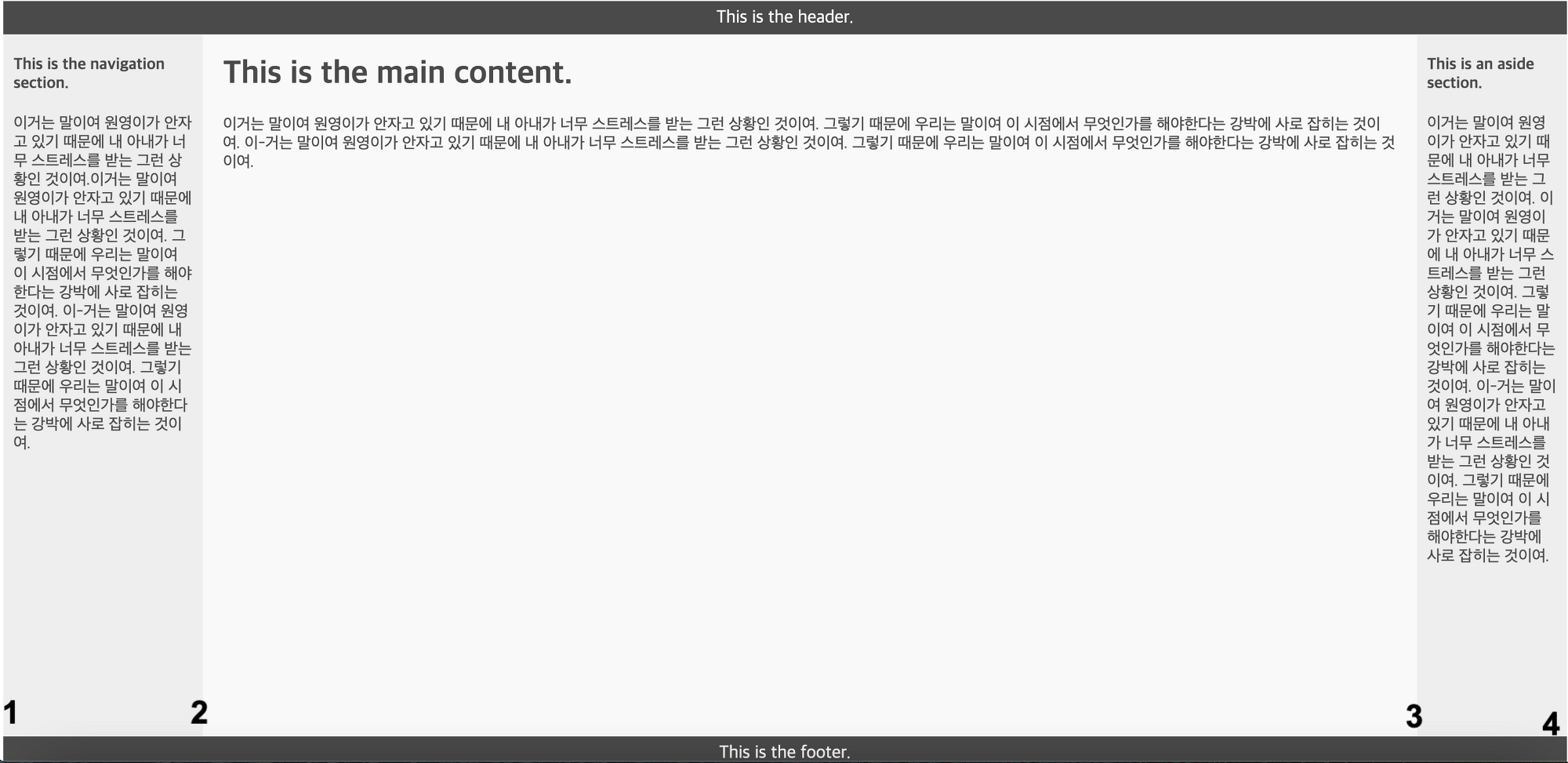 nav 1 ~ 2, main 2 ~ 3, aside 3 ~ 4. 이런식으로 grid의 column을 통해 각 영역을 명확하게 구분해줄 수 있다.