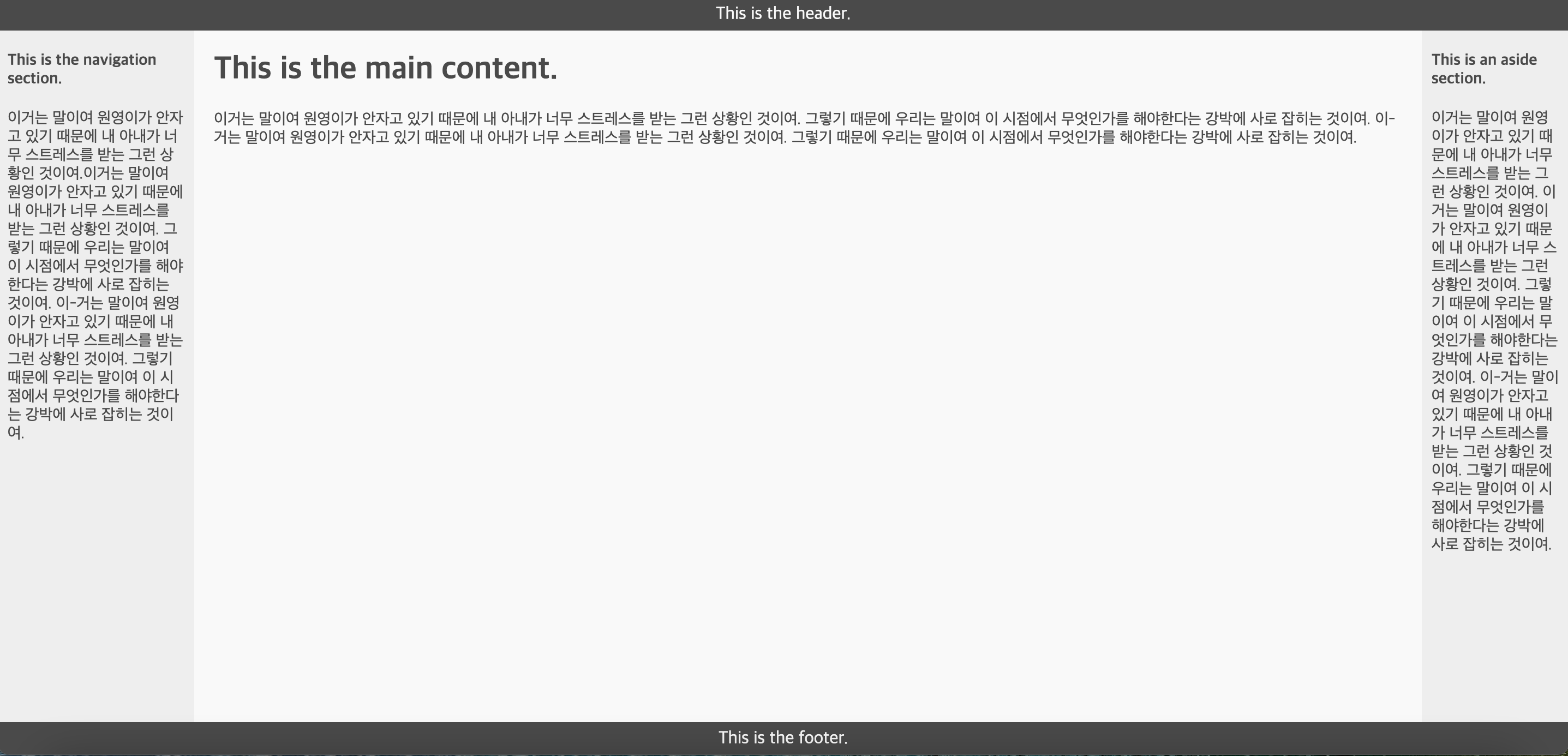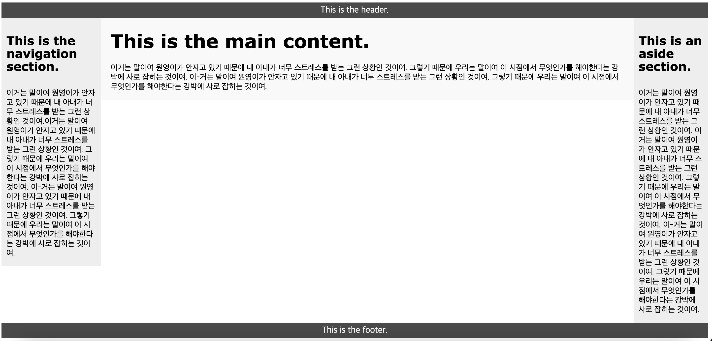 양쪽 좌우 사이드에 위치한 navigation과 aside가 화면의 끝까지 채워졌고 nav, main, aside 영역의 높이가 동일하게 구성이 되었다.